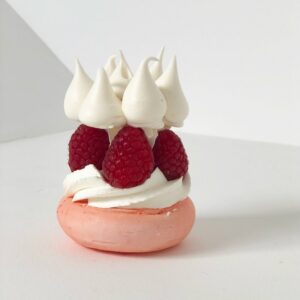 Crème légère mascarpone vanillée, framboises fraîches, meringues craquantes et fondantes
