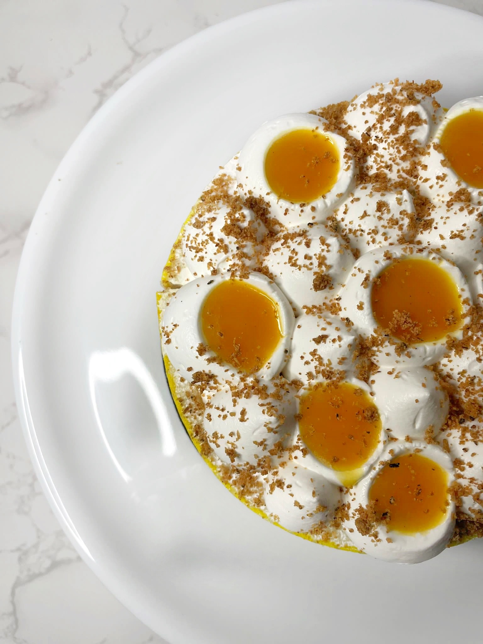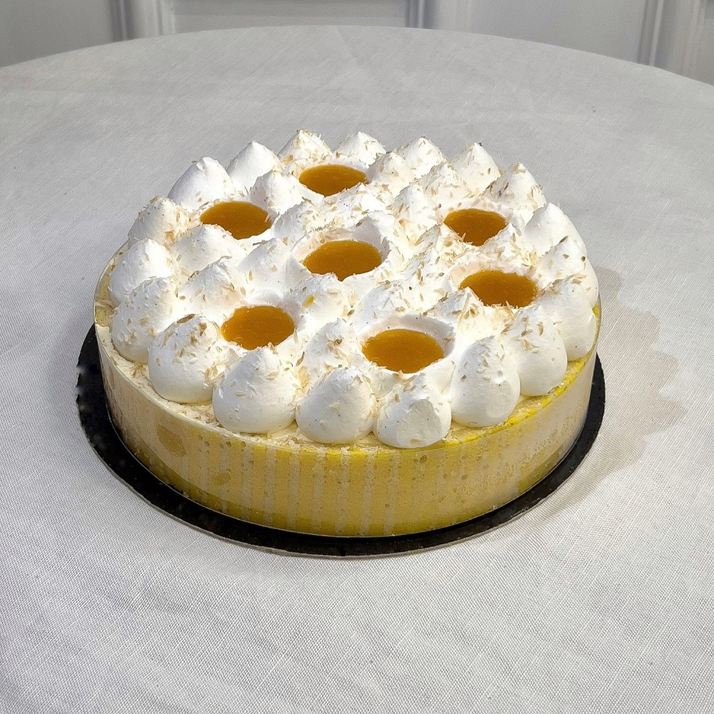 Pain de gênes citron vert, diplomate vanille, marmelade ananas mangue et fruit de la passion, chantilly vanille, coulis de passion vanille gingembre, coco torréfiée à la vanille
