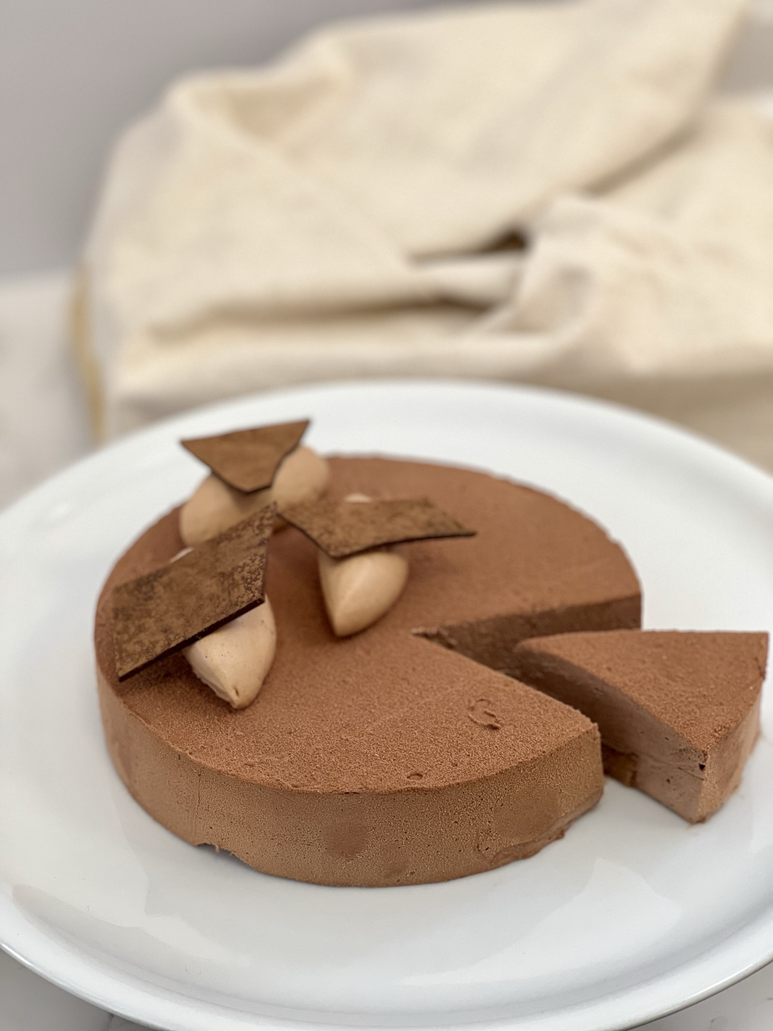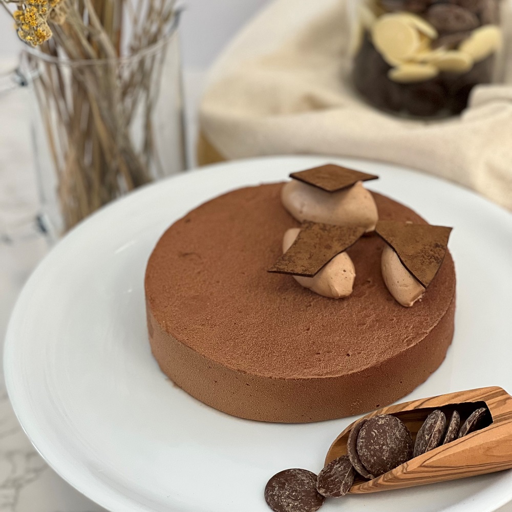 Sur un biscuit amande & croustillant praliné, une mousse légère au chocolat Inaya. Velours de chocolat