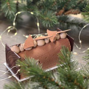 Biscuit aux marrons, marmelade cassis, crème de marrons, mousse aux marrons, meringue, coque chocolat noir 66%.
