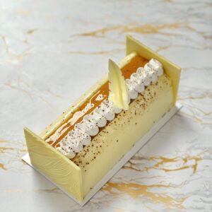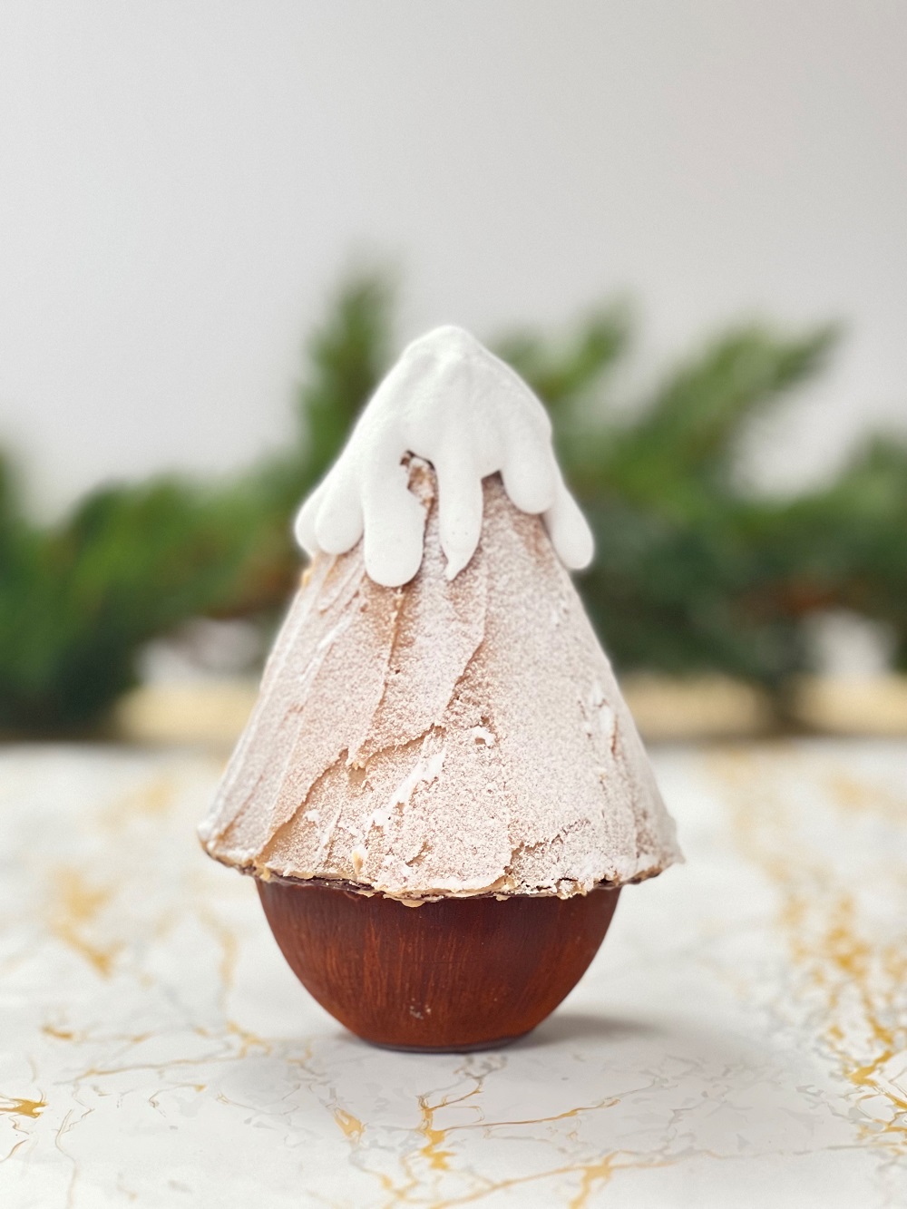 Biscuit aux marrons, marmelade cassis, crème de marrons, mousse aux marrons, meringue, coque chocolat noir 66%. Décor crème de marrons et guimauve vanille.